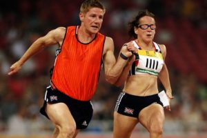 Blind sprinter Tracey Hinton competes while tethered to her guide, Steffan Hughes, in a 2008 race in Beijing. The pair will run together during the Paralympic Games which began Wednesday in London. ACTION IMAGES/ZUMA PRESS